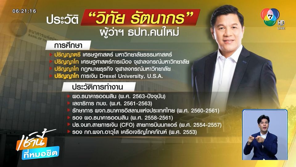 เช้านี้ที่หมอชิต - เมื่อวาน (22 ก.ค.) ที่ประชุม ครม. มีมติแต่งตั้ง นายวิทัย รัตนากร เป็นผู้ว่าการธนาคารแห่งประเทศไทยคนใหม่ มีผลตั้งแต่ 1 ตุลาคม โดยหลายฝ่ายจับตามองการทำงานร่วมกับรัฐบาลในอนาคตว่าจะเป็นอย่างไร