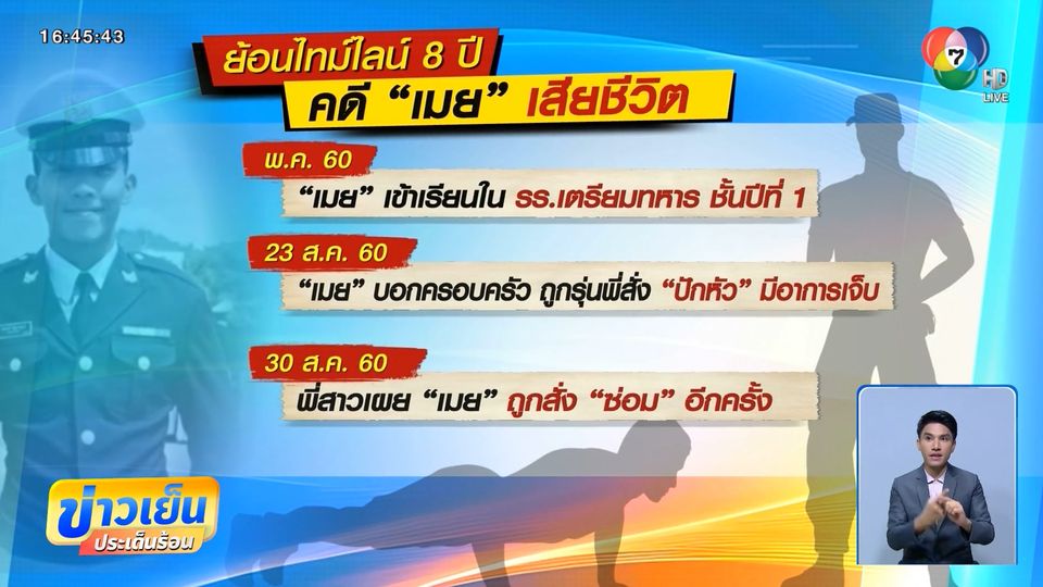 ข่าวเย็นประเด็นร้อน - ถูกต้องตามหลักกฎหมายทหาร แต่ค้านความรู้สึกคนส่วนใหญ่ สำหรับคดีน้องเมย อดีตนักเรียนเตรียมทหาร ชั้นปีที่ 1 ถูกรุ่นพี่เตรียมทหาร ลงโทษจนเสียชีวิต และบทลงโทษยังให้รอลงอาญาไว้ก่อน
