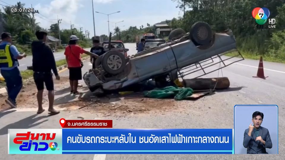 สนามข่าว 7 สี - ที่จังหวัดนครศรีธรรมราช รถกระบะขับมา จู่ ๆ ก็พุ่งชนอัดกับเสาไฟฟ้าเกาะกลางถนน
