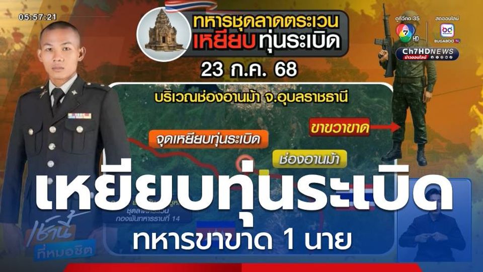 เช้านี้ที่หมอชิต - สถานการณ์ชายแดนไทย-กัมพูชา ร้อนระอุอีกรอบ เมื่อทหารลาดตระเวน เหยียบทุ่นระเบิด รอบที่ 2 เป็นเหตุทำให้ทหารขาขาด 1 นาย