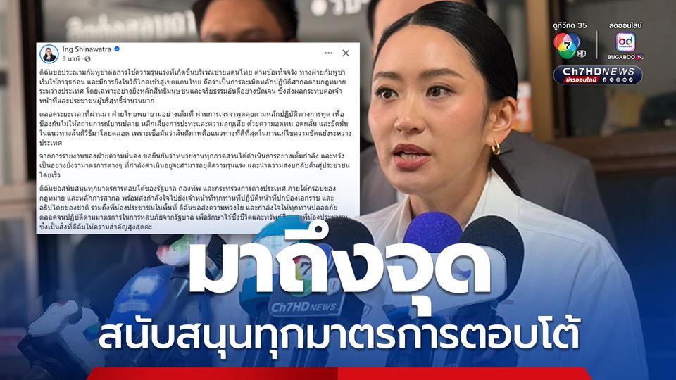 นอกจากประณามกัมพูชา นายกฯอิ๊งค์ ประกาศสนับสนุนทุกมาตรการตอบโต้ของรัฐบาล กองทัพ กระทรวงการต่างประเทศ พร้อมส่งกำลังใจและความห่วงใยถึงพื้นที่ชายแดน