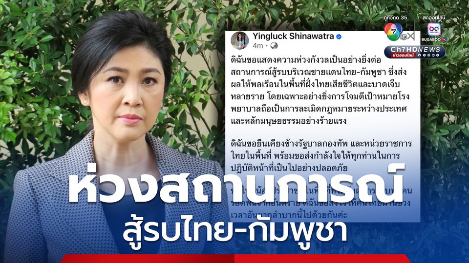 วันนี้ (24 ก.ค. 68) นางสาวยิ่งลักษณ์ ชินวัตร อดีตนายกรัฐมนตรี โพสต์ ข้อความผ่านเฟซบุ๊ก ระบุว่า ดิฉันขอแสดงความห่วงกังวลเป็นอย่างยิ่งต่อสถานการณ์สู้รบบริเวณชายแดนไทย-กัมพูชา ซึ่งส่งผลให้พลเรือนในพื้นที่ฝั่งไทยเสียชีวิตและบาดเจ็บหลายราย