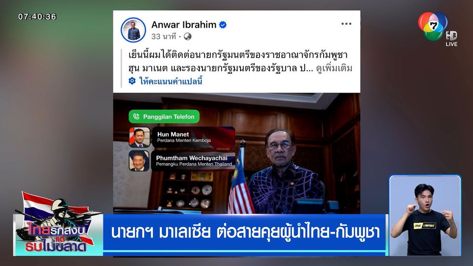 สนามข่าว 7 สี - ท่ามกลางความจากหลายฝ่ายโดยเฉพาะประธานอาเซียน แสดงความกังวลสถานการณ์ชายแดนไทย-กัมพูชา รับหน้าเสื่อเป็นกาวใจ ต่อสายคุยกับ ผู้นำไทย และกัมพูชา ขอให้หยุดยิงทันที เพื่อสร้างพื้นที่เจรจา
