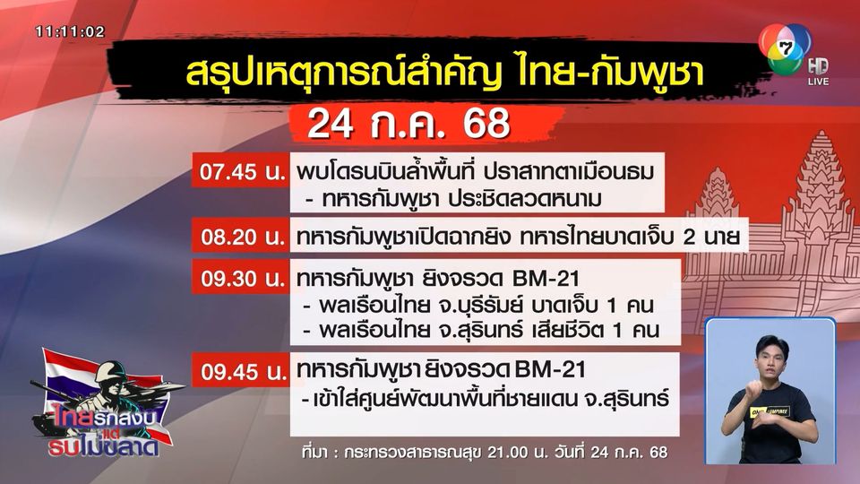 โฆษกกองบัญชาการกองทัพไทย สรุปเหตุการณ์สำคัญที่เกิดขึ้นเมื่อวานนี้ เริ่มจาก 07.45 น. พบโดรนบินล้ำเข้าพื้นที่ ปราสาทตาเมือนธม ก่อนจะมีการเจรจาแต่ไม่เกิดผล แล้วทหารกัมพูชา ก็เปิดฉากยิงใส่ทหารไทยก่อน จนเป็นเหตุให้ทหารไทยบาดเจ็บ 2 นาย
