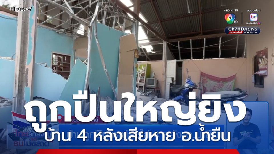 ห้องข่าวภาคเที่ยง -หลังเปิดฉากยิงปะทะวันที่ 2 เริ่มมีรายงานความเสียหายเข้ามาแล้ว ในพื้นที่ปะทะบริเวณช่องบกกับช่องอานม้า อำเภอน้ำยืน มีบ้านเรือนประชาชนได้รับความเสียหายรวม 4 หลัง