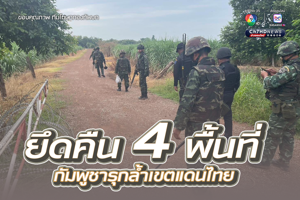 ทีมโฆษกกองทัพบก ระบุ กองกำลังบูรพา กองทัพภาคที่ 1 ยึดคืน 4 พื้นที่ บริเวณชายแดนจังหวัดสระแก้ว ได้แก่ อำเภอตาพระยา 2 พื้นที่ และอำเภอโคกสูง 2 พื้นที่ พร้อมรื้อถอนสิ่งปลูกสร้างของฝ่ายกัมพูชา ที่รุกล้ำเข้ามาในเขตแดนของประเทศไทย