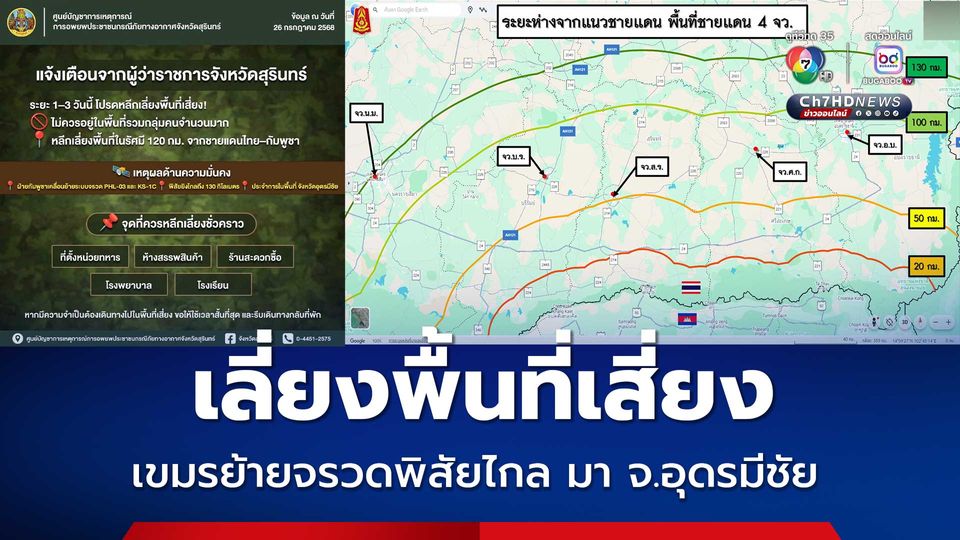 วันนี้ (26 ก.ค.68) เพจเฟซบุ๊กจังหวัดสุรินทร์ แจ้งเตือนจากผู้ว่าราชการจังหวัดสุรินทร์ ว่าในระยะ 1–3 วันนี้ โปรดหลีกเลี่ยงพื้นที่เสี่ยง ไม่ควรอยู่ในพื้นที่รวมกลุ่มคนจำนวนมาก หลีกเลี่ยงพื้นที่ในรัศมี 120 กม. จากชายแดนไทย–กัมพูชา โดยเหตุผลด้านความมั่นคง ฝ่ายกัมพูชาเคลื่อนย้ายระบบจรวด PHL-03 และ KS-1C มีพิสัยยิงไกลถึง 120 กิโลเมตร มาประจำการในพื้นที่ จังหวัดอุดรมีชัย