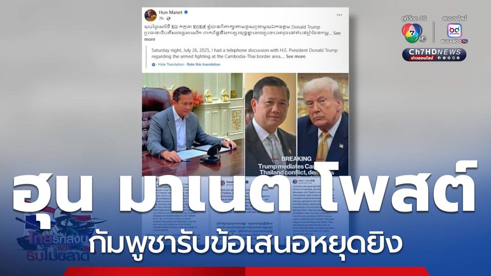 ข่าวเด็ด 7 สี - ฮุน มาเนต นายกรัฐมนตรีกัมพูชา โพสต์ร่ายยาวเรื่องประธานาธิบดีโดนัลด์ ทรัมป์ เผยข่าวดี ไทยเห็นด้วยกับข้อเสนอหยุดยิง