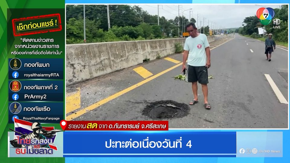ข่าวเด็ด 7 สี - สถานการณ์ชายแดนไทย-กัมพูชา ยังคงมีการยิงปะทะกันอย่างต่อเนื่อง แต่ที่น่าห่วงขณะนี้ยังมีชาวบ้านอยู่ในพื้นที่สีแดงอีกจำนวนมาก ไปติดตามรายงานจากคุณเจษฎา อุปนิ รายงานจาก อำเภอกันทรารมย์ จังหวัดศรีสะเกษ