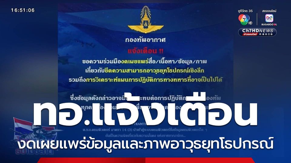 เพจ กองทัพอากาศไทย Royal Thai Air Force ประกาศแจ้งเตือน ขอความร่วมมืองดเผยแพร่ สื่อ เนื้อหา ข้อมูล รูปภาพ ที่เกี่ยวกับขีดความสามารถอาวุธยุทโธปกรณ์เชิงลึก รวมถึงการวิเคราะห์แผนการปฏิบัติการทางทหารที่อาจเป็นไปได้