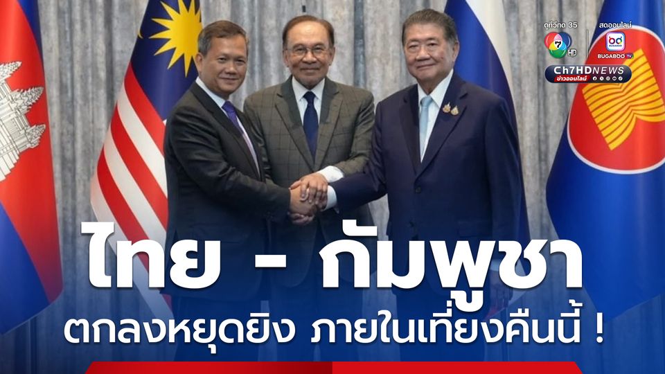 อันวาร์ อิบราฮิม นายกรัฐมนตรีมาเลเซียในฐานะประธานอาเซียน แถลงผลการเจรจา ไทย - กัมพูชา ตกลงหยุดยิง ภายในเที่ยงคืนนี้ ! โดยไม่มีเงื่อนไข ฮุน มาเนตเชื่อ ผลการประชุมวันนี้ จะทำให้ปชช. ทั้ง 2 ประเทศ กลับสู่ชีวิตปกติ และหยุดการสู้รบอย่างแท้จริง