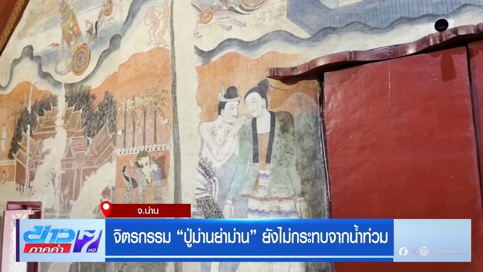 ข่าวภาคค่ำ - น้ำท่วมจังหวัดน่าน ยังไม่พบประติมากรรมฝาผนังปู่ม่านย่าม่าน ที่มีชื่อเสียงของวัดภูมินทร์ได้รับผลกระทบ
