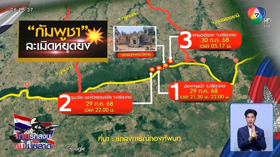 และไม่ใช่แค่จุดเดียว กองทัพบกรายงานว่า คืนวันที่ 29 กรกฎาคม ต่อเนื่องเช้าวันที่ 30 กรกฎาคม กัมพูชาละเมิดการหยุดยิง 3 จุด