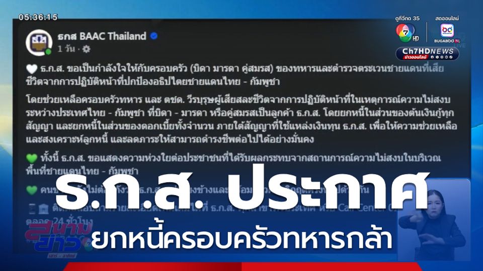สนามข่าวเสาร์-อาทิตย์ - ธนาคารเพื่อการเกษตรและสหกรณ์การเกษตร มีมติเห็นชอบ ยกหนี้ในส่วนของต้นเงินกู้ทุกสัญญา และดอกเบี้ยให้กับครอบครัวของทหาร และตำรวจตระเวนชายแดน ที่เสียสละพลีชีพเพื่อปกป้องอธิปไตย