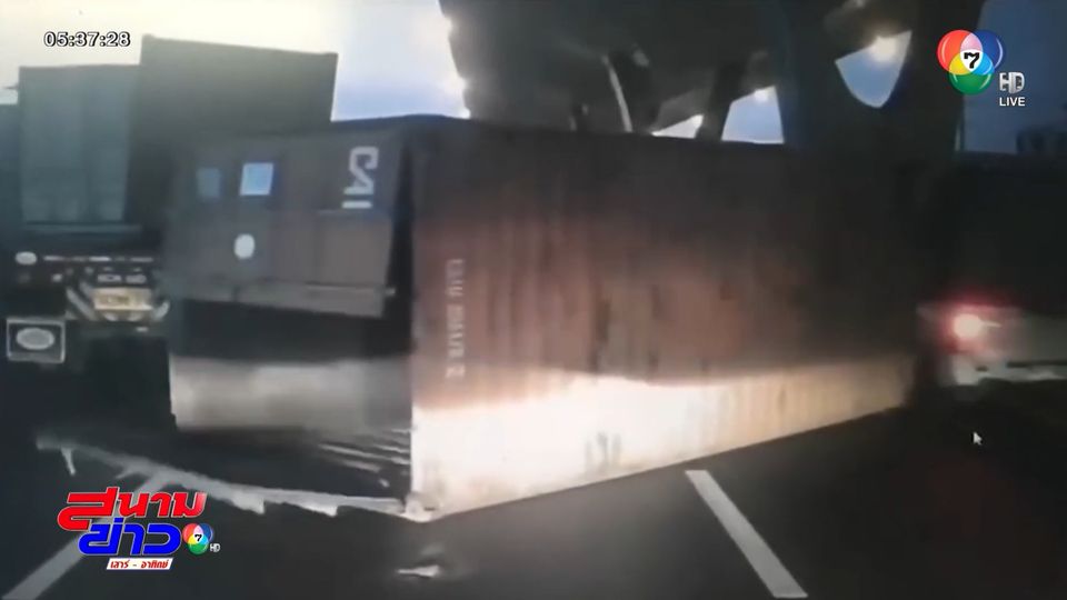 กล้องหน้ารถบันทึกภาพนาที รถบรรทุกตู้คอนเทนเนอร์เร่งเครื่องแซงซ้ายขึ้นมา ก่อนพุ่งชนท้ายรถบรรทุกพ่วงอีกคันที่จอดอยู่ริมทาง เป็นเหตุให้ตู้คอนเทนเนอร์ท้ายรถหล่นขวางพื้นถนน เกือบทับรถคันหลังที่ขับตามมา