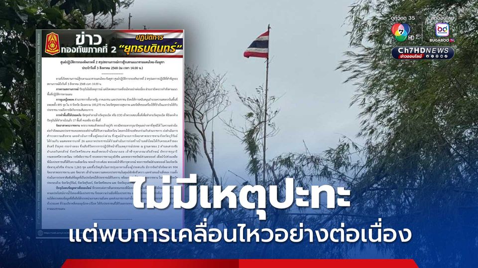 ไม่มีเหตุปะทะ แต่กองทัพภาคที่ 2 ยังพบการเคลื่อนไหวอย่างต่อเนื่อง ส่วนพื้นที่ชั้นใน EOD เข้าตรวจสอบทำลายวัตถุระเบิด ที่ยังตกค้าง ปัจจุบันได้ทำลายไปแล้ว 17 พื้นที่ คงเหลือ 63 พื้นที่