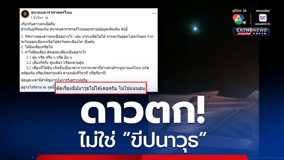 วันนี้ (4ส.ค.68) เวลา 09.40 น. สมาคมดาราศาสตร์ไทย ชี้แจงผ่านเฟซบุ๊ก กรณีหลายพื้นที่ในประเทศไทย พบดวงไฟขนาดใหญ่ พร้อมเสียงระเบิดลั่นท้องฟ้า จนสร้างความหวาดวิตก ว่าอาจเกี่ยวข้องกับการโจมตีจากสถานการณ์ชายแดนไทย-กัมพูชา โดยยืนยันว่า เป็นดาวตกชนิดหนึ่ง ไม่ใช่ขีปนาวุธอย่างแน่นอน และ ขอความร่วมประชาชนที่มีหลักฐานภาพถ่าย หรือแจ้งข้อมูลลักษณะของลูกไฟที่พบเห็น เพื่อประโยชน์ในวิเคราะห์ทางวิทยาศาสตร์ ใจความสำคัญตอนหนึ่ง ดังนี้