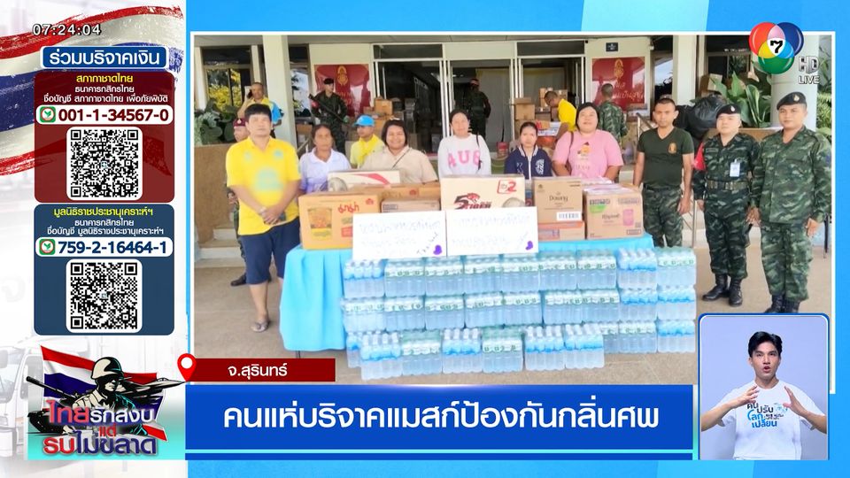 สนามข่าว 7 สี - น้ำใจคนไทยยังหลั่งไหลส่งถึงแนวหน้าเขตชายแดน อย่างจังหวัดสุรินทร์ มีคนบริจาคแมสก์ป้องกันกลิ่นศพของทหารกัมพูชานับแสนชิ้น ส่วนทหารแนวหน้า ต้องการตาข่ายป้องกันโดรนทิ้งระเบิด