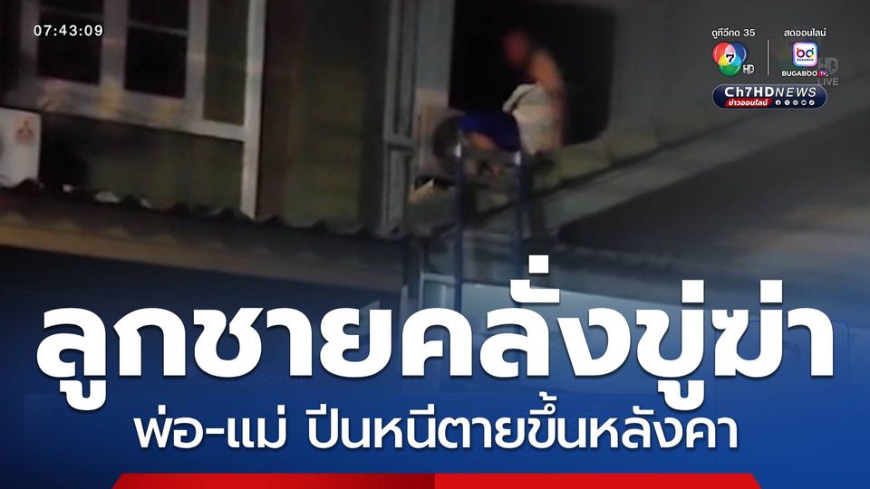 สนามข่าว 7 สี - สามีภรรยาหนีตายปีนหน้าต่างห้องนอนออกมาอยู่หลังคาบ้าน หลังลูกชายเมาเหล้าหนักคลุ้มคลั่ง ถือมีดตะโกนขู่ฆ่าคนในบ้าน สุดท้ายเพื่อนบ้านต้องโทรศัพท์แจ้งตำรวจให้ช่วยเหลือ
