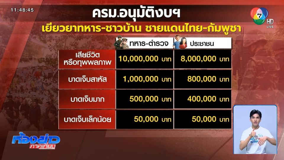 ห้องข่าวภาคเที่ยง - วันนี้ คณะรัฐมนตรี จะพิจารณาอนุมัติเงินเยียวยาให้กับผู้ได้รับผลกระทบจากสถานการณ์ชายแดนไทย-กัมพูชา ทั้งในส่วนของประชาชนและทหารเสียชีวิต