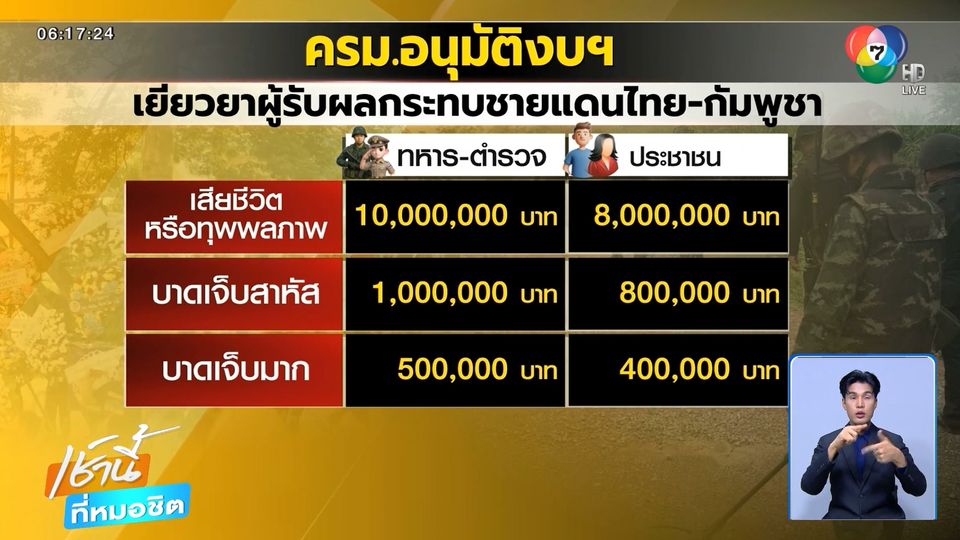 เช้านี้ที่หมอชิต - เป็นที่แน่ชัด !! รัฐบาลเคาะเงินเยียวยาเพิ่มให้กับทั้ง ทหาร ตำรวจ และประชาชนที่ได้รับบาดเจ็บ และเสียชีวิตจากเหตุการณ์ความไม่สงบในพื้นที่ชายแดนไทย-กัมพูชา