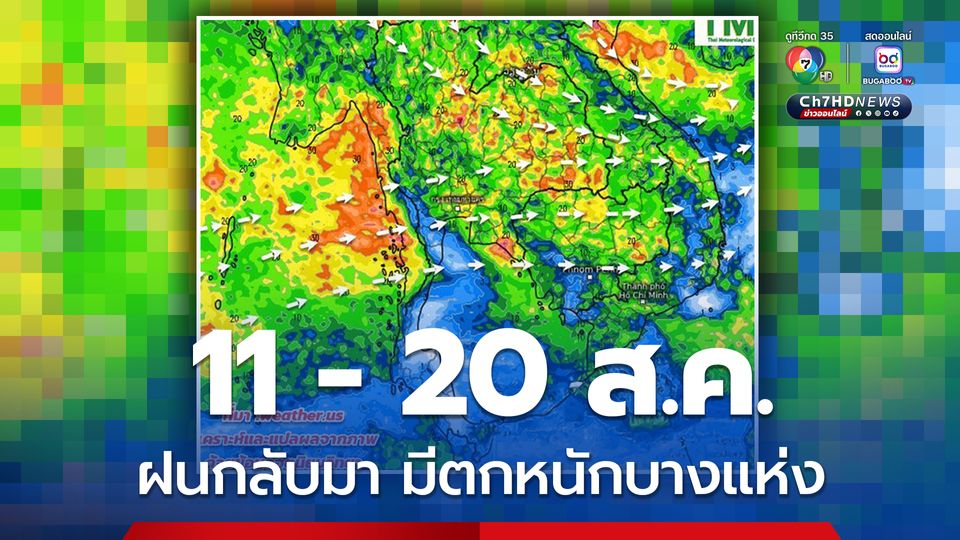 #ฝนฟ้าอากาศ 11- 20 ส.ค.ทั่วไทยมีแนวโน้มฝนกระจายเพิ่มขึ้น และมีฝนตกหนักบางแห่ง ในพื้นที่ภาคเหนือ อีสาน กลาง ตะวันออก กทม.และปริมณฑล ย้ำ ในระยะนี้ยังไม่มีสัญญาณการก่อตัวของพายุเคลื่อนเข้าไทย