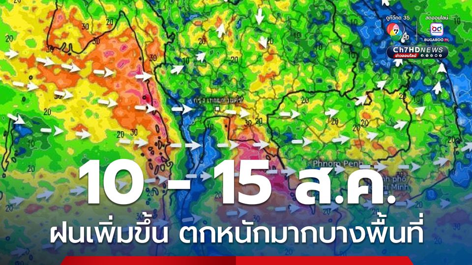 อนึ่ง ในช่วงวันที่ 10 - 15 ส.ค. ประเทศไทยจะมีฝนเพิ่มขึ้น และมีฝนตกหนักบางแห่ง โดยมีฝนตกหนักมากบางพื้นที่ในภาคตะวันออก และภาคใต้ฝั่งตะวันตก เนื่องจากจะมีร่องมรสุมพาดผ่านภาคเหนือ และภาคตะวันออกเฉียงเหนือ ประกอบกับมรสุมตะวันตกเฉียงใต้ที่พัดปกคลุมทะเลอันดามัน ประเทศไทย และอ่าวไทยจะมีกำลังแรงขึ้น