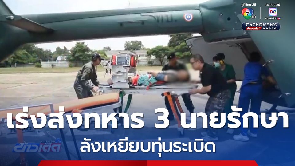 ข่าวเด็ด 7 สี - เจ้าหน้าที่เร่งส่งตัวทหารที่ได้รับบาดเจ็บ จากการเหยียบทุ่นระเบิดขณะเดินลาดตระเวน โดยเฮลิคอปเตอร์ เป็นการเร่งด่วน