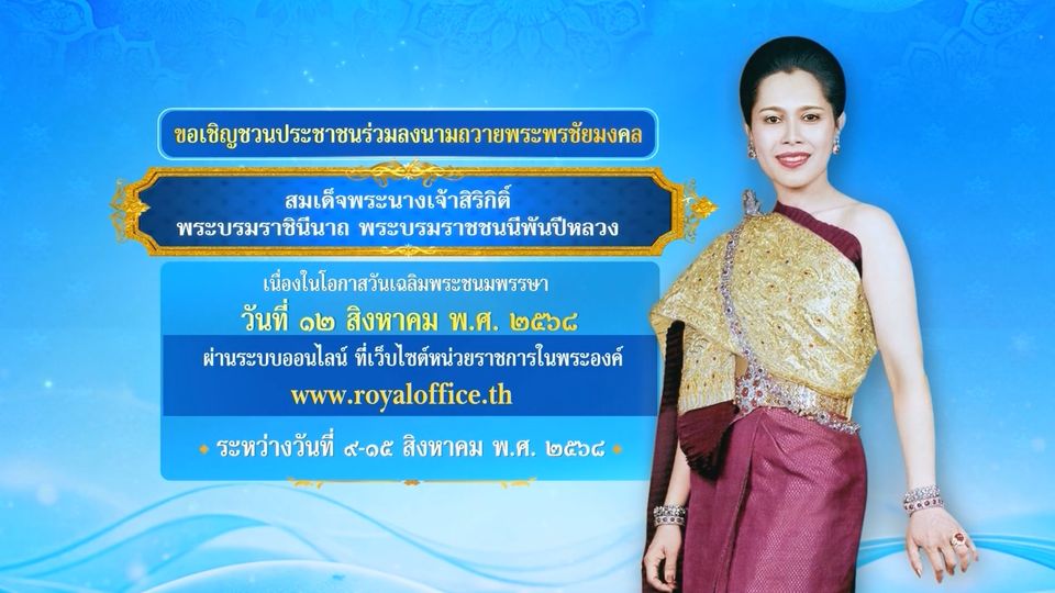 สำนักพระราชวัง ขอเชิญชวนประชาชนร่วมลงนามถวายพระพรชัยมงคล สมเด็จพระนางเจ้าสิริกิติ์ พระบรมราชินีนาถ พระบรมราชชนนีพันปีหลวง เนื่องในโอกาสวันเฉลิมพระชนมพรรษา วันที่ 12 สิงหาคม 2568 ผ่านระบบออนไลน์ ที่เว็บไซต์หน่วยราชการในพระองค์ www.royaloffice.th ระหว่างวันที่ 9-15 สิงหาคม 2568
