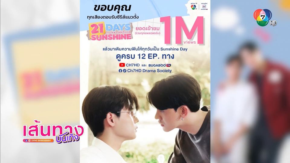 เส้นทางบันเทิง - ท้ายนี้ขอบคุณทุกเสียงตอบรับที่มีให้กับซีรีส์แนวตั้ง "21 Days Sunshine 21 วันของฉันกับเธอ" ที่ปล่อยให้ได้รับชมกันแบบเต็มเรื่องแล้ว 12 EP. กับยอดเข้าชมรวมทุกแพลตฟอร์ม 1 ล้านวิว ใครยังไม่ได้ดู ชวนมาเติมความฟินกันได้ทาง YouTube Ch7HD, BUGABOO.TV, Facebook และ TikTok Ch7HD Drama Society