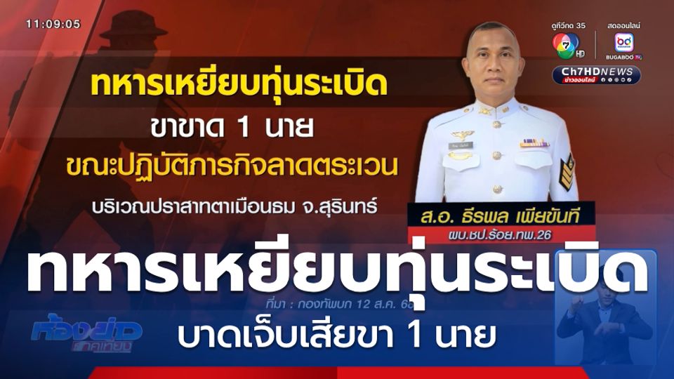 ห้องข่าวภาคเที่ยง - ทหารเหยียบทุ่นระเบิด ขาขาด 1 นาย นำตัวส่งโรงพยาบาลแล้ว