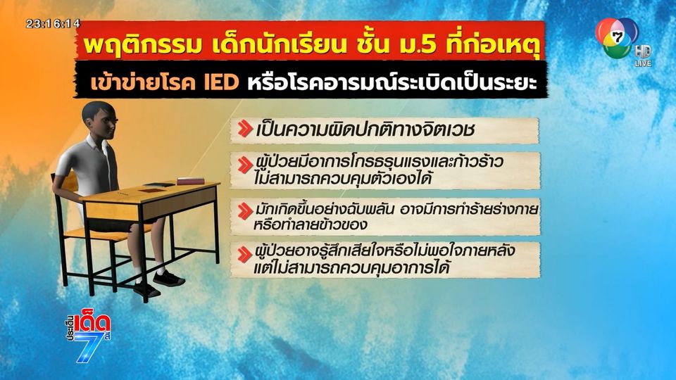 ประเด็นเด็ด 7 สี - ตัวแทนผู้ว่าราชการจังหวัดอุทัยธานี มอบกระเช้าให้ ครูหนูเล็ก หลังถูกนักเรียนชายชั้น ม.5 ทำร้ายร่างกายเจ็บสาหัส ข้อมูลทางแพทย์ชี้ว่า เด็กเข้าข่ายโรคอารมณ์ระเบิดเป็นระยะ หรือ IED