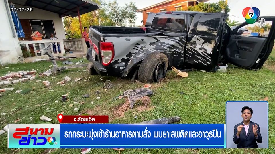 สนามข่าว 7 สี - รถกระบะพุ่งชนรถจักรยานยนต์ 2 คัน ก่อนเฉี่ยวชนท้ายรถกระบะ และเสียหลักพุ่งเข้าไปในร้านอาหารตามสั่ง พบยาเสพติด และอาวุธปืน 1 กระบอก