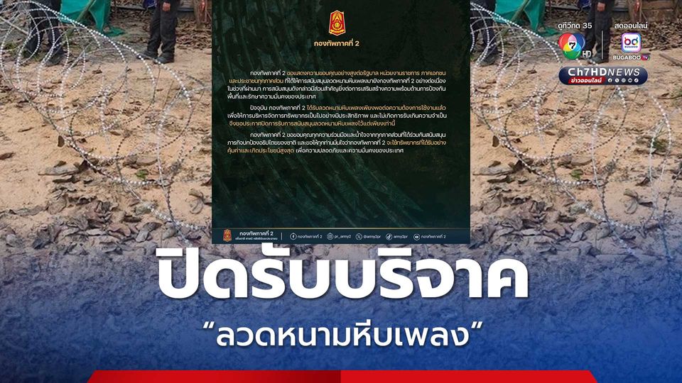 กองทัพภาคที่ 2 ปิดรับบริจาค “ลวดหนามหีบเพลง” หลังเปิดขอรับการสนับสนุนไม่ถึง 24 ชั่วโมง ระบุได้เพียงพอต่อความต้องการใช้งานแล้ว