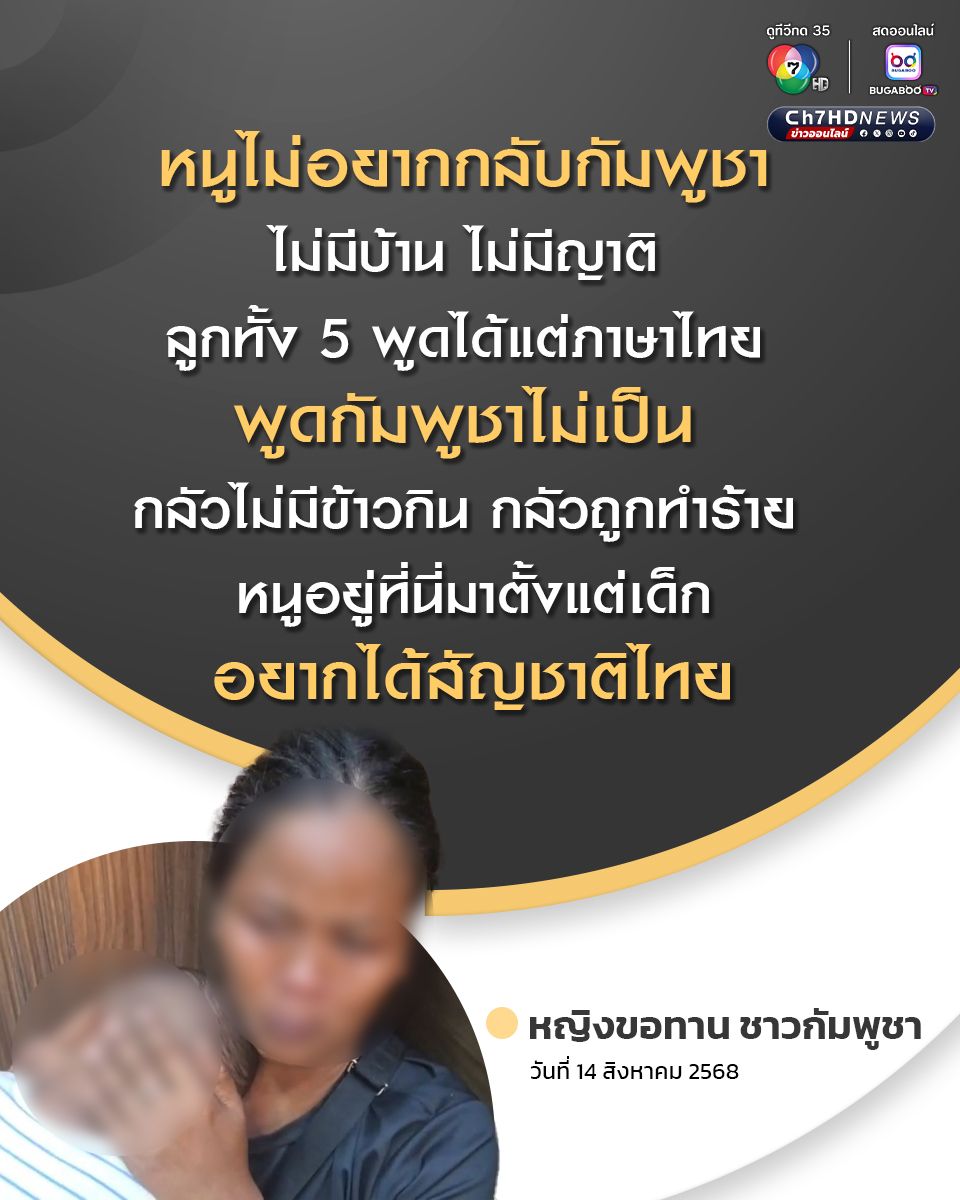 เมื่อถามว่า รู้จัก “ฮุน เซน” หรือไม่ เธอส่ายหน้าทันที พร้อมตอบเสียงสั่นว่า “ไม่รู้จัก” ก่อนเล่าถึงความหวาดกลัวต่อสถานการณ์บ้านเมืองปัจจุบันของกัมพูชา ที่เธอเชื่อว่าไม่ปลอดภัยต่อชีวิตและลูก ๆ