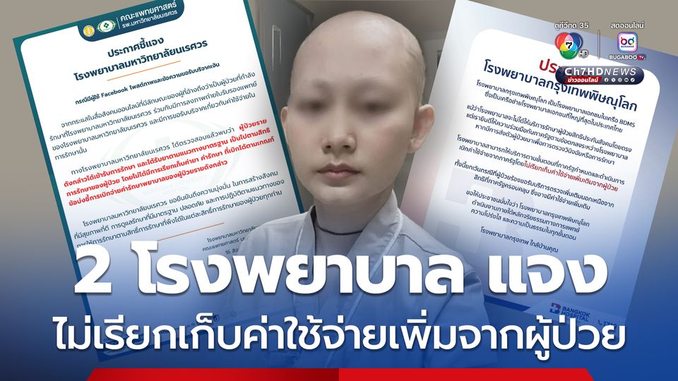 2 โรงพยาบาล แจง รักษาผู้ป่วยมะเร็งเต้านม เบิกค่าใช้จ่ายจากภาครัฐ โดยไม่เรียกเก็บค่าใช้จ่ายเพิ่มเติมจากผู้ป่วย ยกเว้นกรณีที่ผู้ป่วยร้องขอรับบริการตรวจเพิ่มเติม นอกเหนือจากสิทธิที่ภาครัฐครอบคลุม ซึ่งอาจมีค่าใช้จ่ายเพิ่มเติม