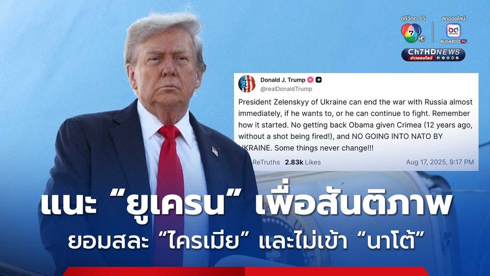 วันนี้ (18 ส.ค. 68) สำนักข่าวต่างประเทศรายงานว่า ประธานาธิบดี โดนัลด์ ทรัมป์ แห่งสหรัฐฯ โพสต์ข้อความผ่านแพลตฟอร์ม Truth Social กดดันประธานาธิบดี โวโลดิมีร์ เซเลนสกี แห่งยูเครน ว่า “ประธานาธิบดี เซเลนสกี แห่งยูเครน สามารถยุติสงครามกับรัสเซียได้เกือบจะภายในทันทีเลย หากเขาต้องการ หรือเขาอยากจะสู้ต่อก็ได้ จะไม่มีการได้ “ไครเมีย” ที่เสียไปในยุคโอบามากลับคืนมา และยูเครนจะต้องไม่เข้าร่วม “นาโต้” (NATO) บางสิ่งก็ไม่เคยเปลี่ยนแปลง” (“ไครเมีย” ถูกรัสเซียผนวกเป็นอาณาเขตตั้งแต่ปี พ.ศ.2557)