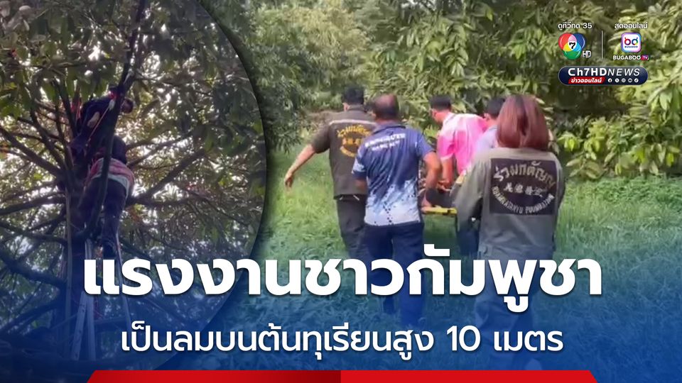ระทึก แรงงานชาวกัมพูชา เป็นลมบนต้นทุเรียน สูง 10 เมตร เจ้าหน้าที่กู้ต้องปีนขึ้นไปปฐมพยาบาลบนต้นทุเรียน แต่อาการยังไม่ดีขึ้น เพราะแขนขาอ่อนแรง กู้ภัยจึงต้องใช้ชุดเซฟตีคล้องกับตัวคนงาน แล้วช่วยลงมาได้อย่างปลอดภัย
