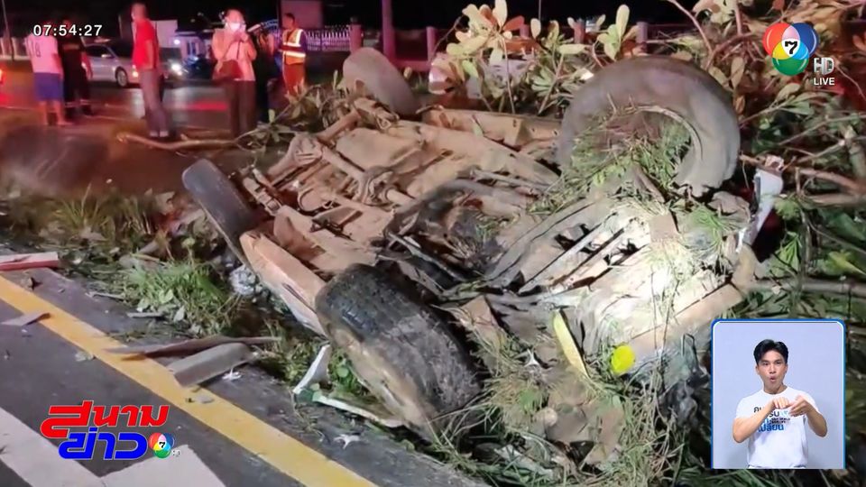 สนามข่าว 7 สี - ผู้กองซิ่งรถกระบะเสียหลักชนป้ายบอกทาง ต้นไม้กลางถนน บาดเจ็บเพียงเล็กน้อย เจ้าตัวยิ้มร่า เชื่อบารมีท้าวเวสสุวรรณรักษาชีวิต