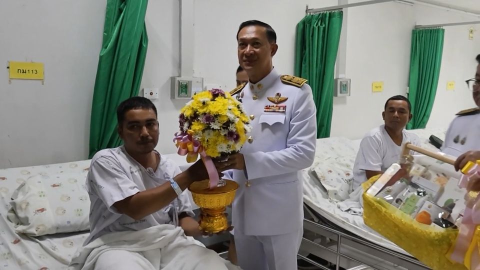 พระบาทสมเด็จพระเจ้าอยู่หัว และสมเด็จพระนางเจ้า ฯ พระบรมราชินี พระราชทานดอกไม้และตะกร้าสิ่งของแก่เจ้าหน้าที่อาสาสมัครรักษาดินแดนที่ได้รับบาดเจ็บจากเหตุการณ์ความไม่สงบ