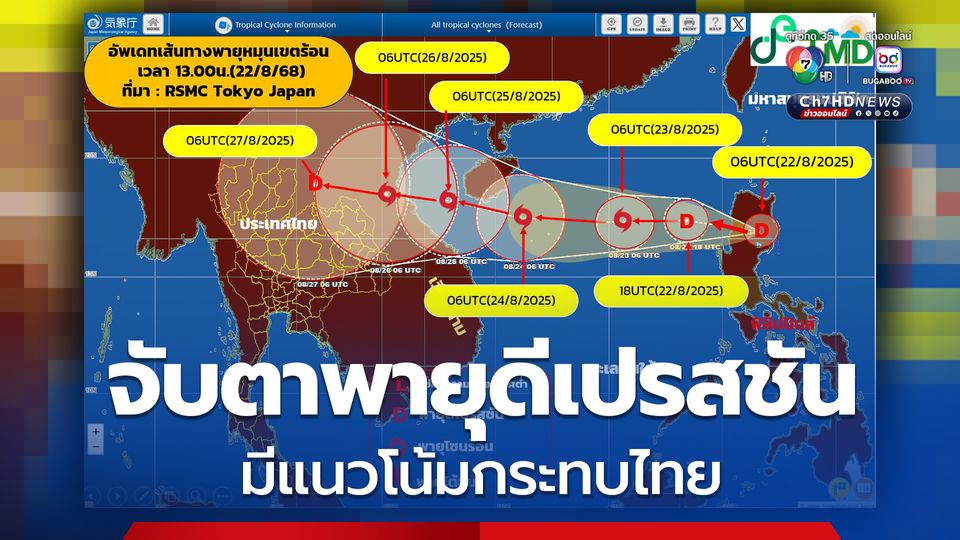 วันนี้ (22 ส.ค. 68) กรมอุตุนิยมวิทยาคาดว่า พายุดีเปรสชันดังกล่าวมีแนวโน้มทวีกำลังแรงขึ้นเป็นพายุโซนร้อน และจะเคลื่อนตัวขึ้นฝั่งบริเวณประเทศเวียดนามและลาวตอนบนในช่วงวันที่ 25–26 ส.ค. 68 อิทธิพลของพายุจะทำให้ประเทศไทยมีฝนตกหนักถึงหนักมาก และมีลมแรง