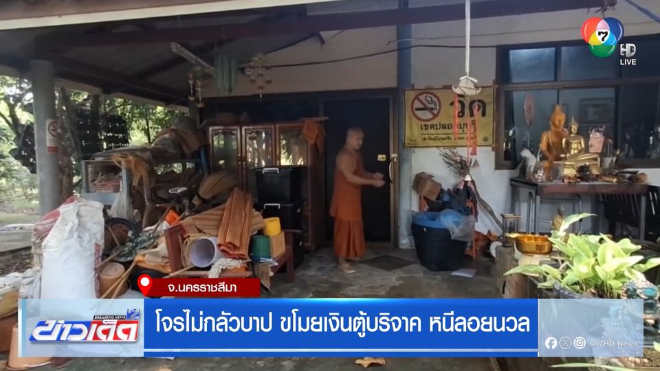 ภาพหลักฐานจากวงจรปิด ภายในวัดทุ่งพนมวัง ตำบลมิตรภาพ อำเภอสีคิ้ว จังหวัดนครราชสีมา เผยให้เห็นวินาที ชายสวมเสื้อกล้ามสีดำ เดินเข้าไปในวัด ก่อเหตุบุกพังประตูกุฏิเจ้าอาวาส ขโมยเงินบริจาคของวัดไปจำนวนหนึ่ง ก่อนจะรีบหลบหนีลอยนวล