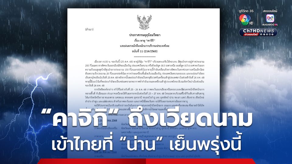 กรมอุตุนิยมวิทยา ประกาศเวลา 05.00 น. วันนี้ (25 ส.ค. 68) ว่าเมื่อเวลา 04.00 น. พายุไต้ฝุ่น “คาจิกิ” บริเวณทะเลจีนใต้ตอนบน มีศูนย์กลางอยู่ห่างประมาณ 200 กิโลเมตร ทางทิศตะวันออกเฉียงใต้ของเมืองวิญ ประเทศเวียดนาม หรือที่ละติจูด 18.3 องศาเหนือ ลองจิจูด 107.6 องศาตะวันออก ความเร็วลมสูงสุดใกล้ศูนย์กลางประมาณ 150 กิโลเมตรต่อชั่วโมง พายุนี้กำลังเคลื่อนตัวทางทิศตะวันตกค่อนทางเหนือเล็กน้อย ด้วยความเร็วประมาณ 20 กิโลเมตรต่อชั่วโมง คาดว่าจะเคลื่อนขึ้นฝั่งบริเวณเมืองวิญ ประเทศเวียดนามตอนบน และจะอ่อนกำลังลงเป็นพายุโซนร้อนในวันที่ 25 ส.ค. 68 หลังจากนั้นจะอ่อนกำลังลงเป็นพายุดีเปรสชันเคลื่อนเข้าสู่ประเทศลาวในช่วงเช้าวันที่ 26 ส.ค. 68 พายุนี้มีแนวโน้มที่จะอ่อนกำลังลงเป็นหย่อมความกดอากาศต่ำกำลังแรงและเคลื่อนเข้าสู่ประเทศไทยบริเวณจังหวัดน่านในช่วงเย็นของวันที่ 26 ส.ค. 68