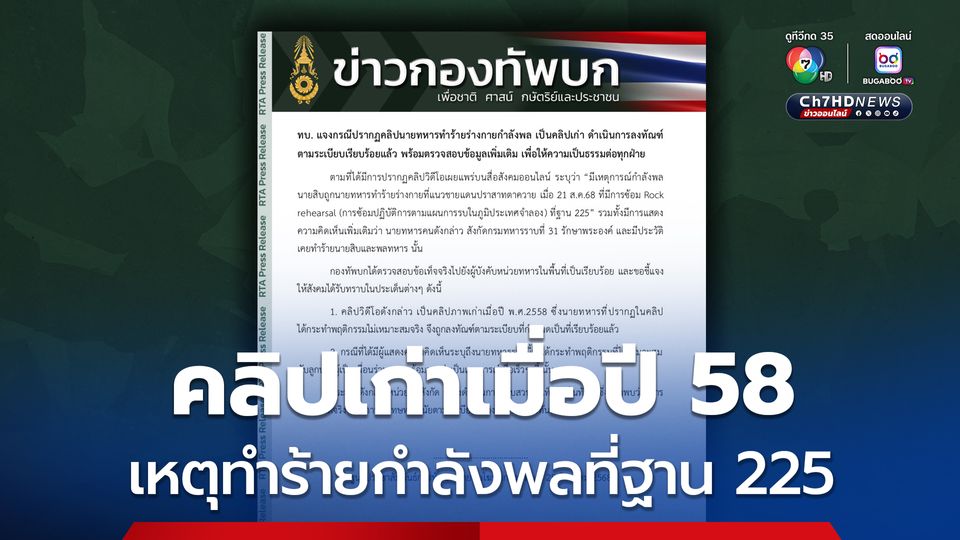 ทบ. แจงกรณีปรากฏคลิปนายทหารทำร้ายร่างกายกำลังพล เป็นคลิปเก่า ดำเนินการลงทัณฑ์ตามระเบียบเรียบร้อยแล้ว พร้อมตรวจสอบข้อมูลเพิ่มเติม เพื่อให้ความเป็นธรรมต่อทุกฝ่าย