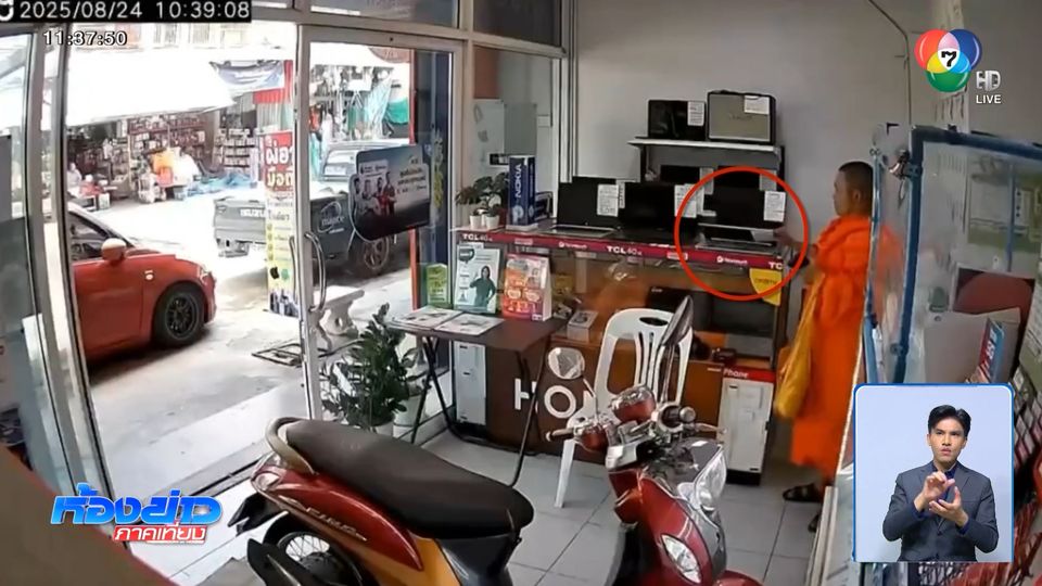 ห้องข่าวภาคเที่ยง - ชายแต่งกายคล้ายพระภิกษุ เดินไปหน้าร้านขายโทรศัพท์มือถือ และคอมพิวเตอร์ อาศัยทีเผลอ ฉวยโน๊ตบุ๊กที่วางโชว์อยู่ลงย่าม ขโมยหนีไป