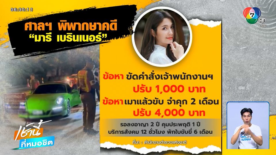 เพราะเหตุนี้ เธอจึงถูกตำรวจแจ้งข้อหาขัดคำสั่งเจ้าพนักงาน ถูกปรับชั้นพนักงานสอบสวน 1,000 บาท ส่วนข้อหาขับรถขณะเมาสุรา ศาลฯ พิพากษา จำคุก 2 เดือน ปรับ 4,000 บาท รอลงอาญา 2 ปี คุมประพฤติ 1 ปี รายงานตัว 3 ครั้ง บริการสังคม 12 ชั่วโมง และพักใบขับขี่ 6 เดือน