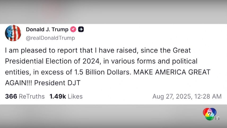 ประธานาธิบดี โดนัลด์ ทรัมป์ แห่งสหรัฐฯ โพสต์ข้อความโซเชียลมีเดียว่า นับตั้งแต่ชนะการเลือกตั้งประธานาธิบดี เมื่อเดือนพฤศจิกายนปีที่ผ่านมา เขาระดมทุนสนับสนุนได้แล้วกว่า 1.5 พันล้านเหรียญสหรัฐฯ หรือเกือบ 50,000 ล้านบาท ผ่านหลายหน่วยงานและหลากหลายรูปแบบ ซึ่งเป็นการแสดงให้เห็นว่า เขายังมีอิทธิพลและการสนับสนุนอย่างต่อเนื่องในทางการเมือง