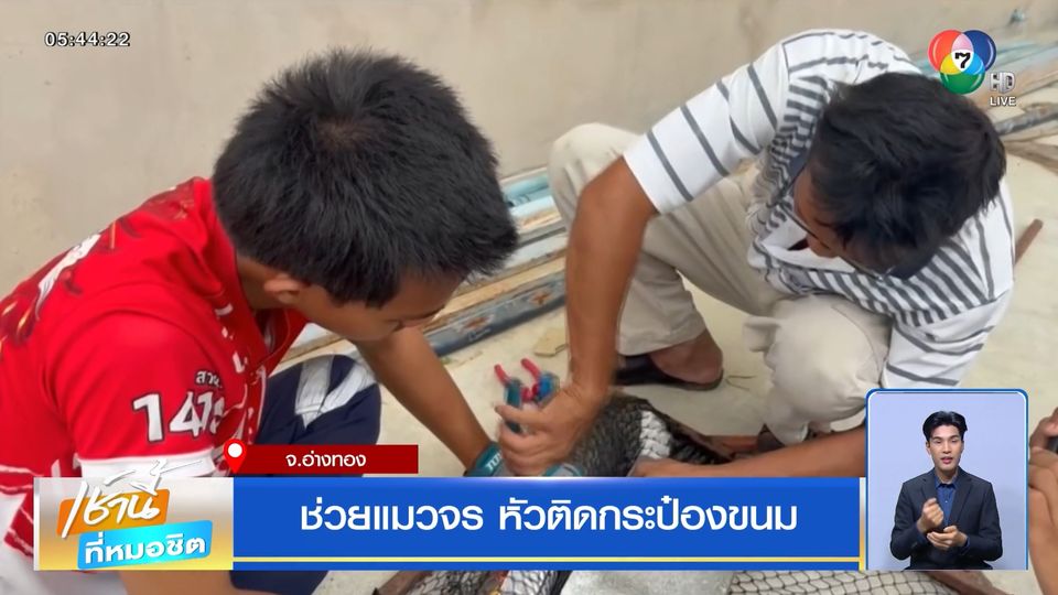 ภาพนาทีเจ้าหน้าที่กู้ภัย กำลังย่องใช้สวิงตาข่ายจับแมวจร ที่หัวมีกระป๋องพลาสติกขนมครอบอยู่ นอนซมหมดแรงอยู่บนกำแพงรั้วบ้านหลังหนึ่ง ที่ตำบลศาลาแดง อำเภอเมือง จังหวัดอ่างทอง จากนั้นพอนำแมวลงมาได้ ก็ช่วยกันใช้คีมกรรไกร ค่อยตัดกระป๋องออกจากหัวแมว ใช้เวลาสักพักด้วยความระมัดระวัง