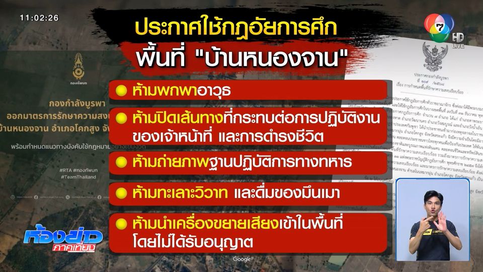โดยอาศัยอำนาจ ตามความในมาตรา 11 แห่งพระราชบัญญัติกฎอัยการศึก พุทธศักราช 2557 รักษาความสงบเรียบร้อยในพื้นที่ สั่งห้ามพกพาอาวุธทุกชนิด ห้ามปิดเส้นทางที่ส่งผลกระทบต่อการปฏิบัติงานของเจ้าหน้าที่ และการดำรงชีวิตประชาชน ห้ามถ่ายภาพฐานปฏิบัติการทางทหาร ห้ามทะเลาะวิวาท และดื่มของมึนเมา และห้ามนำเครื่องขยายเสียงเข้าในพื้นที่โดยไม่ได้รับอนุญาต