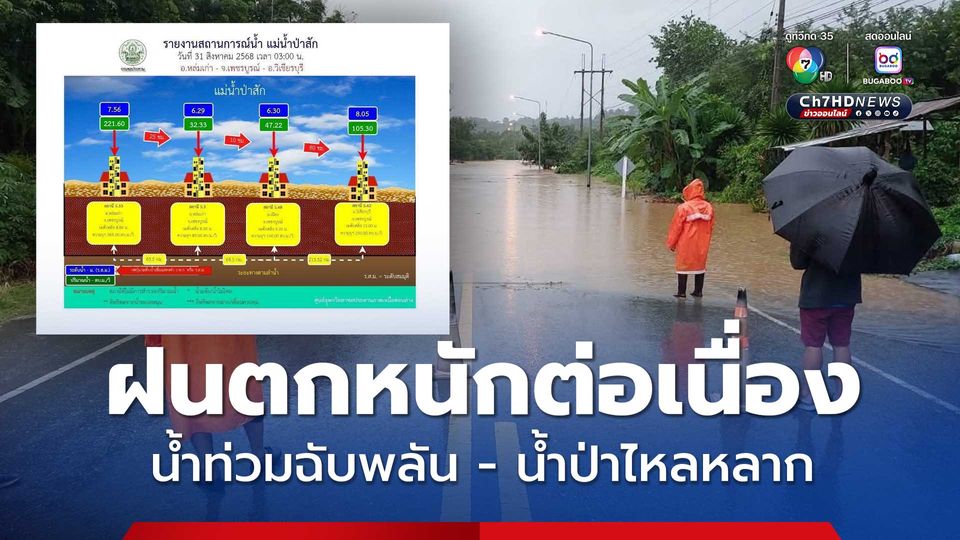 (31 ส.ค. 68) เนื่องจากอิทธิพล “พายุหนองฟ้า” ทำให้มีฝนตกหนักต่อเนื่องติดต่อกันเป็นระยะเวลานาน ส่งผลให้น้ำในแม่น้ำ ลำน้ำ และห้วยต่างๆ ในพื้นที่ ได้มีระดับสูงขึ้นอย่างรวดเร็ว เกิดน้ำท่วมฉับพลัน น้ำป่าไหลหลาก ไหลเข้าท่วมบ้านเรือน ทรัพย์สินและพื้นที่ทางการเกษตรของประชาชน